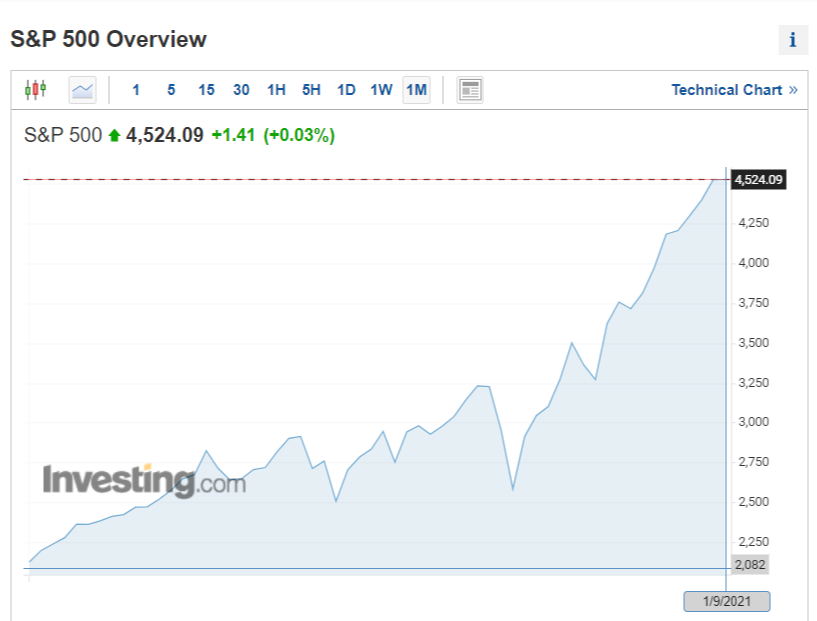 미국 인덱스 S&P500 주가 가 무서운 상승세로 치딛고 있습니다.